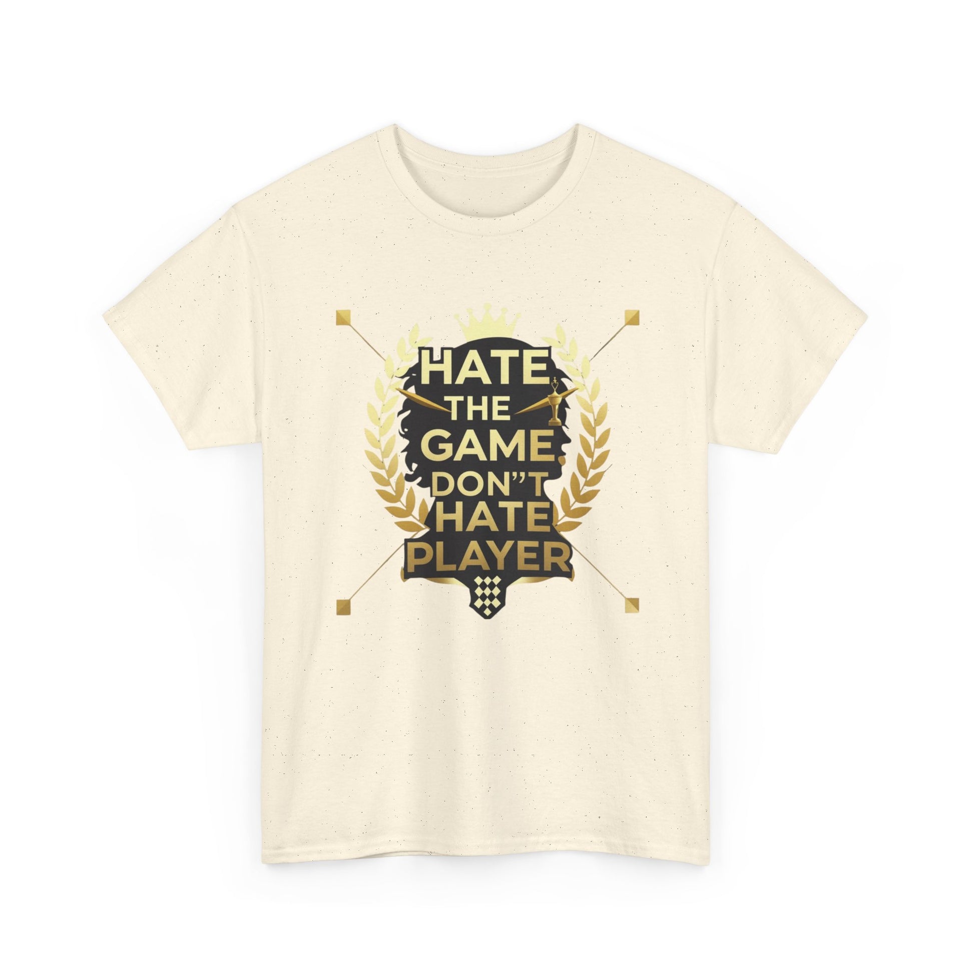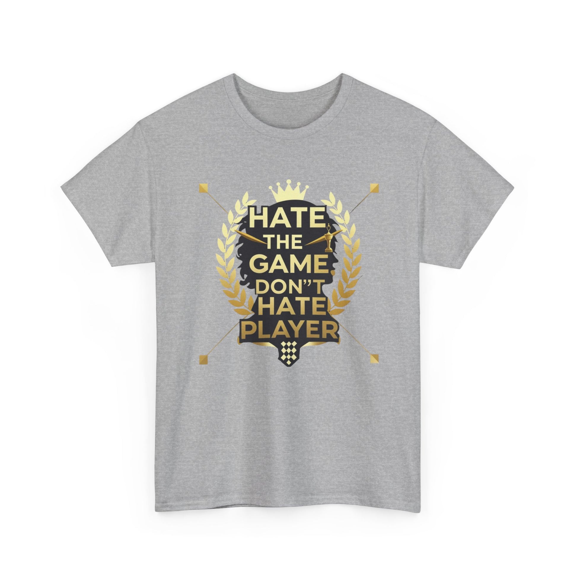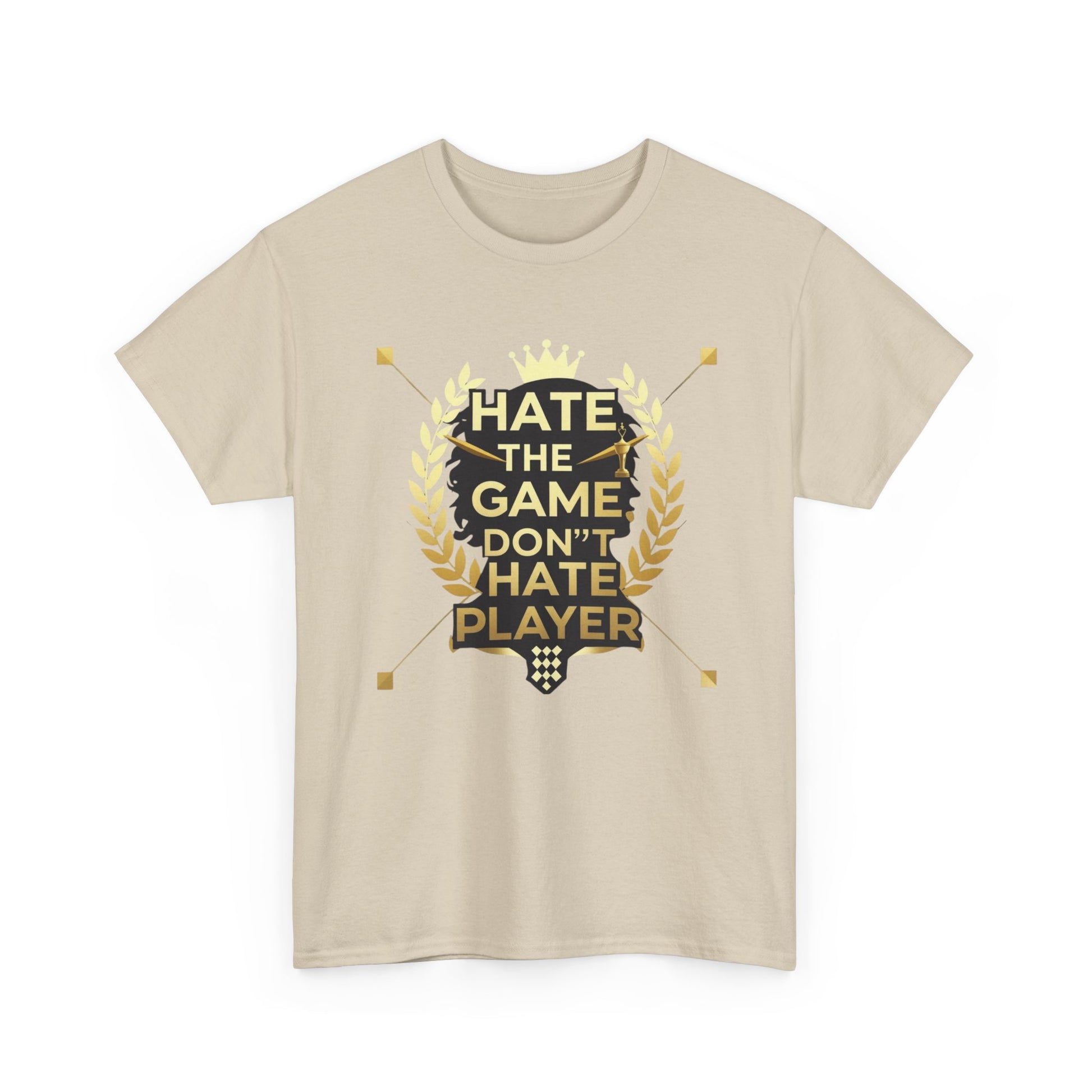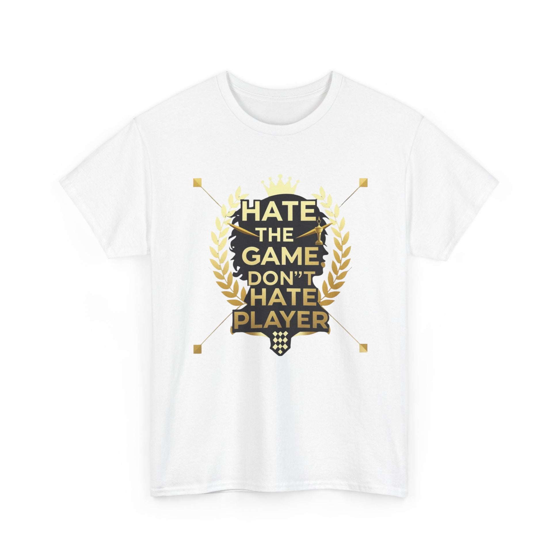 This cotton tee carries a bold gaming attitude with a clean, trophy-inspired graphic: a black silhouette head framed by golden laurel leaves and the phrase “HATE THE GAME, DON’T HATE THE PLAYER.” It sits on a classic crewneck, relaxed-fit tee that wears comfortably all day. The print uses crisp DTF/DTG techniques for sharp detail on both the main chest art and any sleeve/neck accents. Wear it to gaming nights, conventions, or when you want to broadcast quiet confidence between matches. The natural cotton body breathes and softens with each wash, while the tear-away label and ribbed collar keep things comfortable. Built to meet safety and sustainability standards, this shirt blends gamer pride with durable, responsibly sourced fabric.