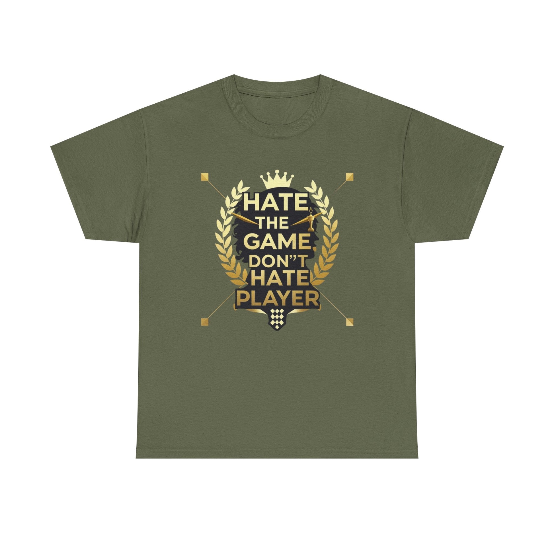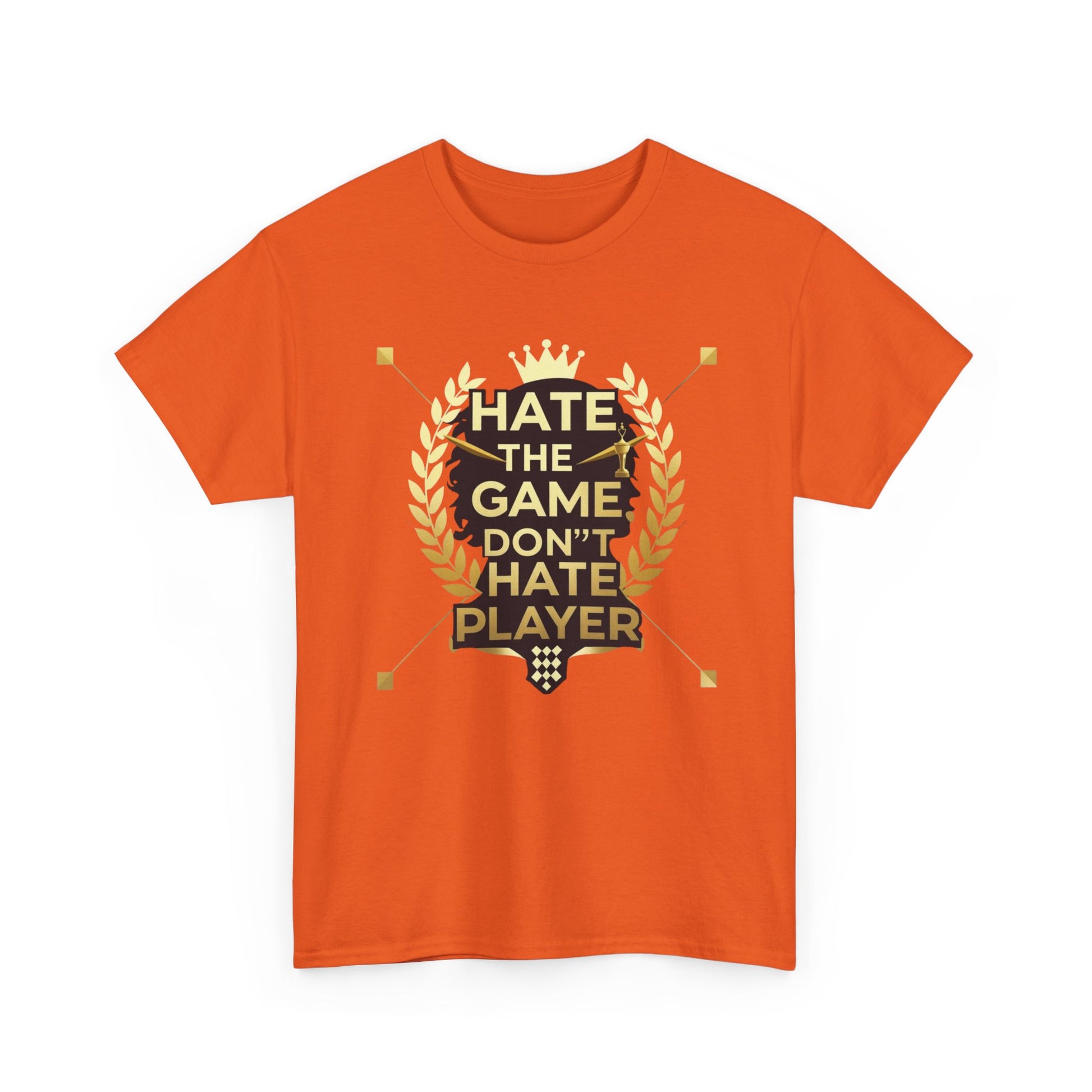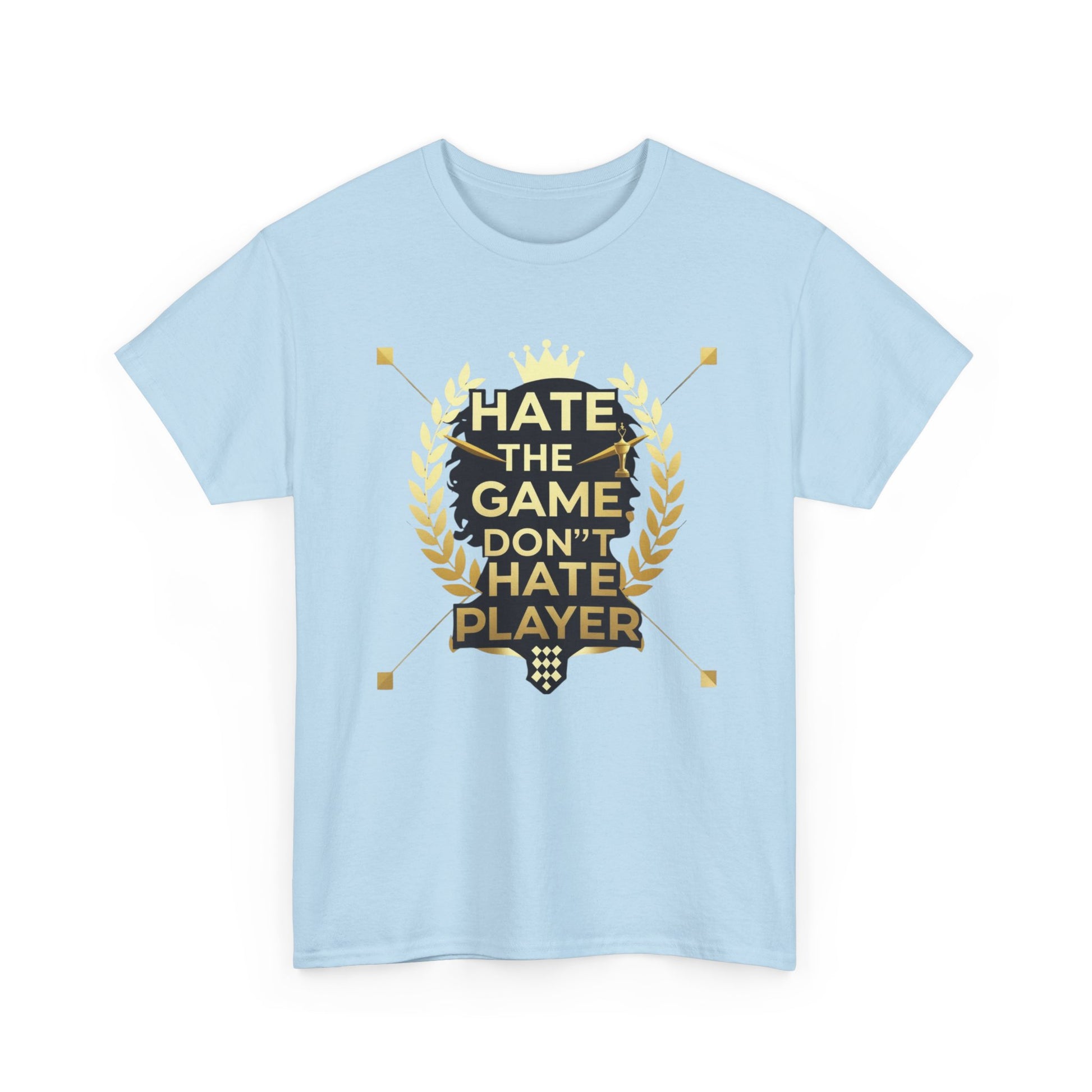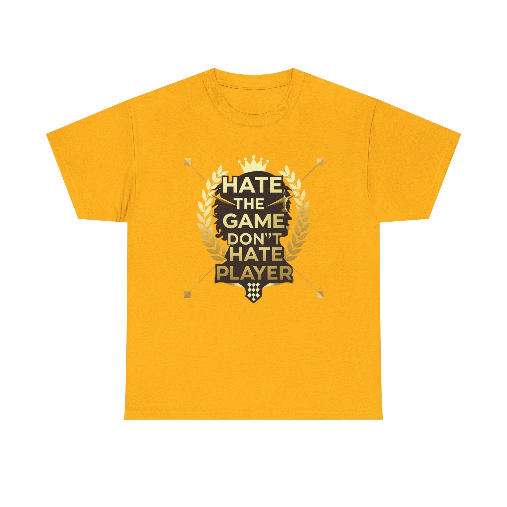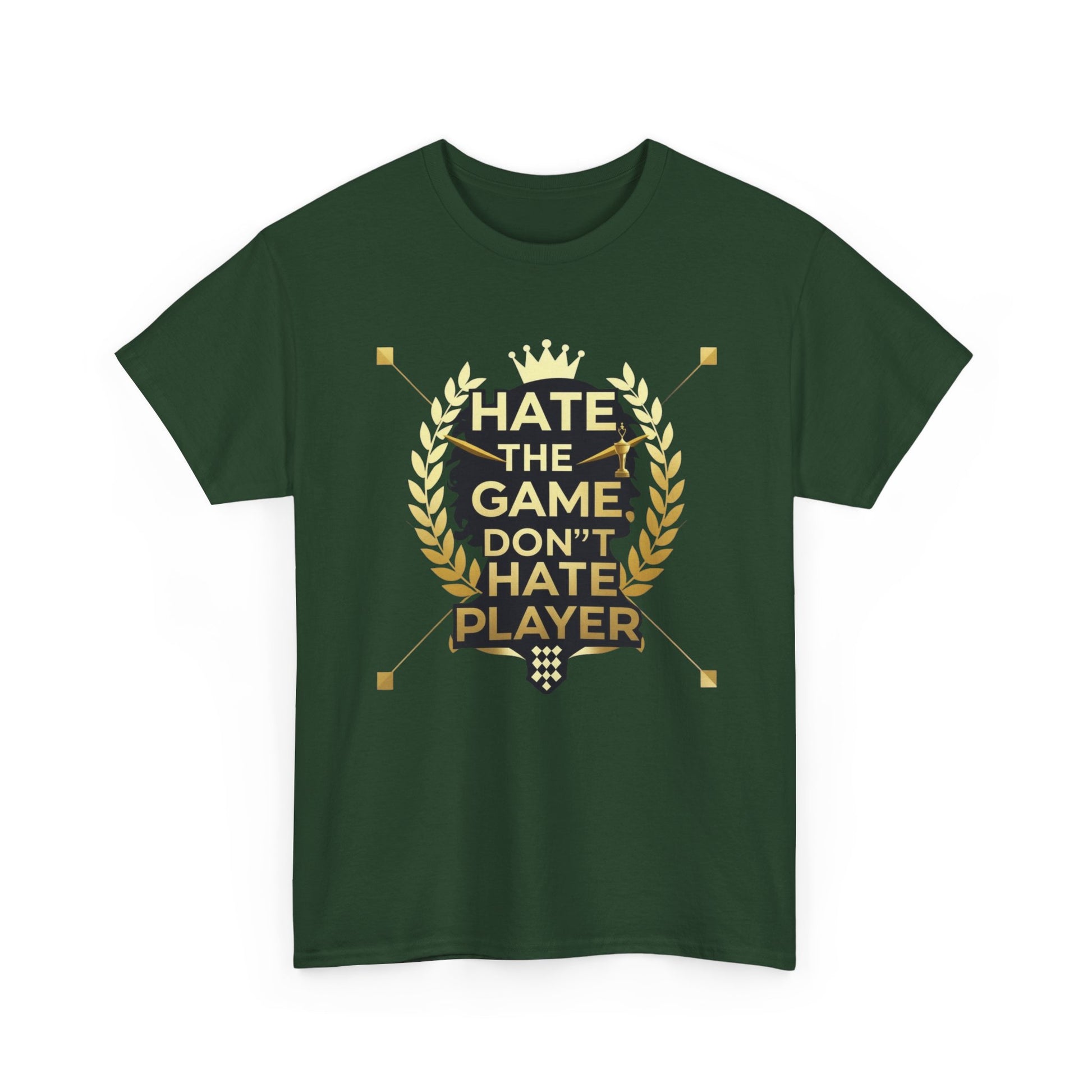 This cotton tee carries a bold gaming attitude with a clean, trophy-inspired graphic: a black silhouette head framed by golden laurel leaves and the phrase “HATE THE GAME, DON’T HATE THE PLAYER.” It sits on a classic crewneck, relaxed-fit tee that wears comfortably all day. The print uses crisp DTF/DTG techniques for sharp detail on both the main chest art and any sleeve/neck accents. Wear it to gaming nights, conventions, or when you want to broadcast quiet confidence between matches. The natural cotton body breathes and softens with each wash, while the tear-away label and ribbed collar keep things comfortable. Built to meet safety and sustainability standards, this shirt blends gamer pride with durable, responsibly sourced fabric.