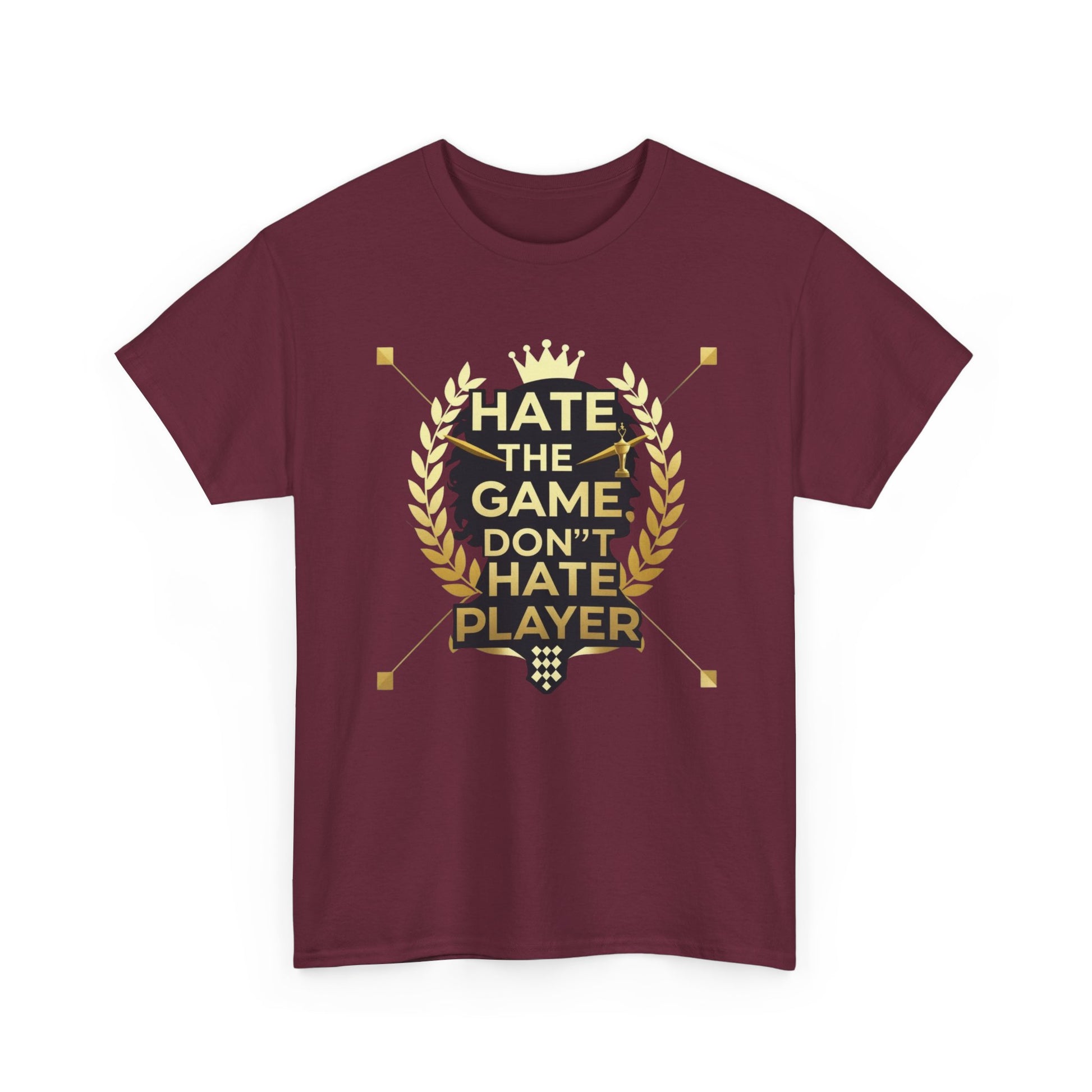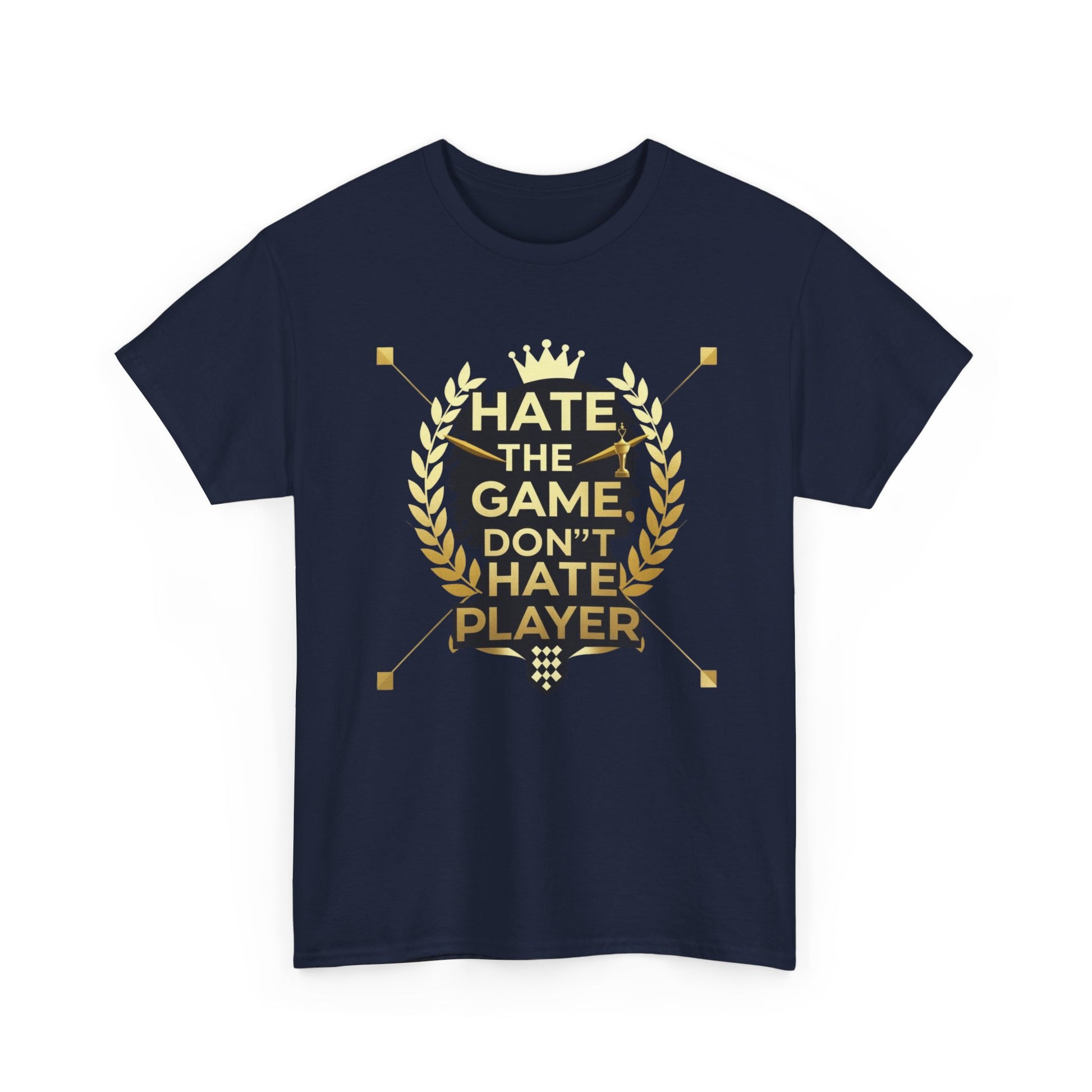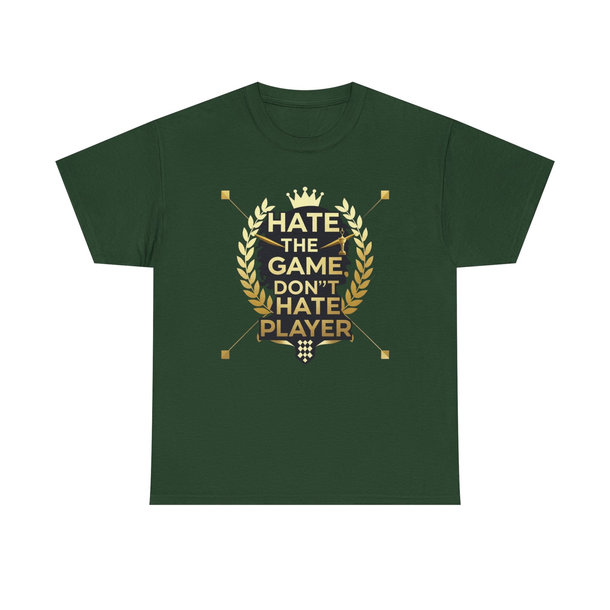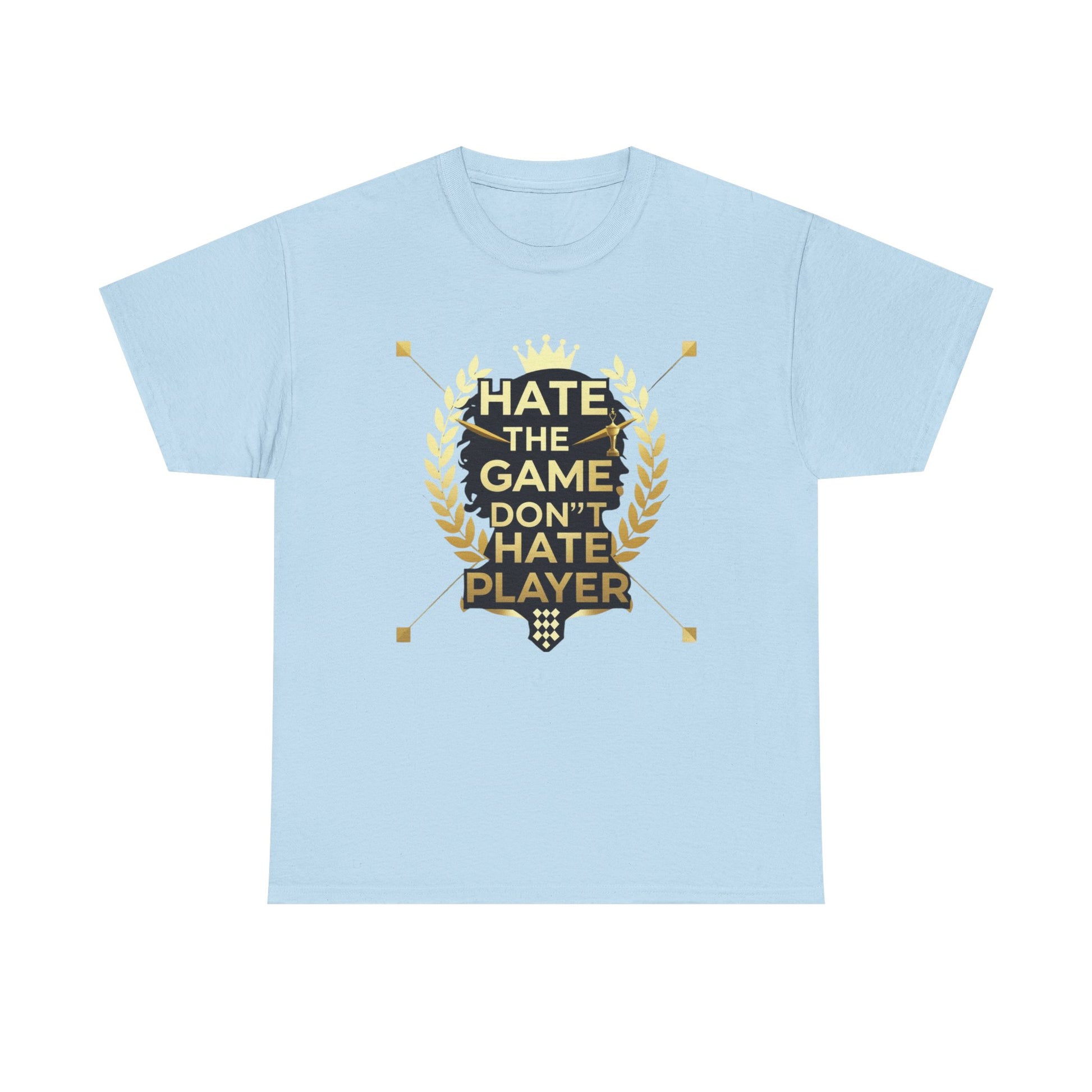 This cotton tee carries a bold gaming attitude with a clean, trophy-inspired graphic: a black silhouette head framed by golden laurel leaves and the phrase “HATE THE GAME, DON’T HATE THE PLAYER.” It sits on a classic crewneck, relaxed-fit tee that wears comfortably all day. The print uses crisp DTF/DTG techniques for sharp detail on both the main chest art and any sleeve/neck accents. Wear it to gaming nights, conventions, or when you want to broadcast quiet confidence between matches. The natural cotton body breathes and softens with each wash, while the tear-away label and ribbed collar keep things comfortable. Built to meet safety and sustainability standards, this shirt blends gamer pride with durable, responsibly sourced fabric.